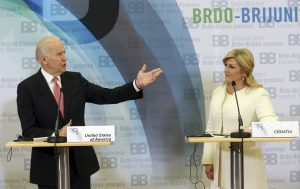 U.S. Vice-President Joe Biden gestures as Croatia's President Kolinda Grabar-Kitarovic looks on during a joint press conference after Brdo-Brijuni Process summit in Zagreb, Croatia, Wednesday, Nov. 25. 2015. U.S. Vice President Joe Biden arrived in Zagreb Wednesday for a Western Balkans summit, highlighting renewed interest from Washington in the fragile region as it deals with an unprecedented influx of refugees. (AP Photo/Pool via AP)