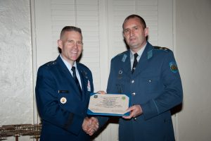 Lt. Gen. Steven Kwast, commander and president, Air University, inducts Maj. Gen. Rumen Radev, commander, Bulgarian air force, into the International Honor Roll, Dec. 3, 2014. Radev attended Air War College and Squadron Officer School. IHR recognizes international graduates who attain leadership positions in their country as chief of their service or higher. (U.S. Air Force photo by Melanie Rodgers Cox/Released)