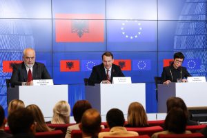 Edi Rama, Radosław Sikorski and Marta Kos in a press conference following EU-Albania IGC; Photo: European Union
