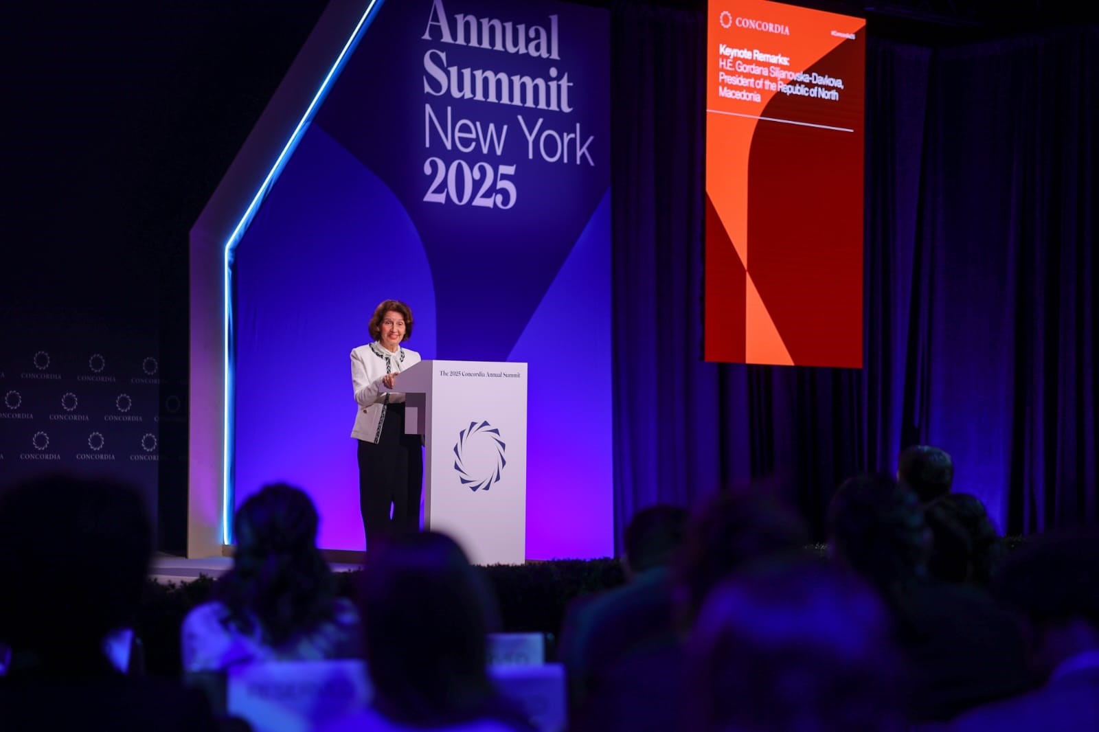 Gordana Siljanovska-Davkova speaks at "Concordia" summit, September 2025, New York; Photo: X /@gogamdk